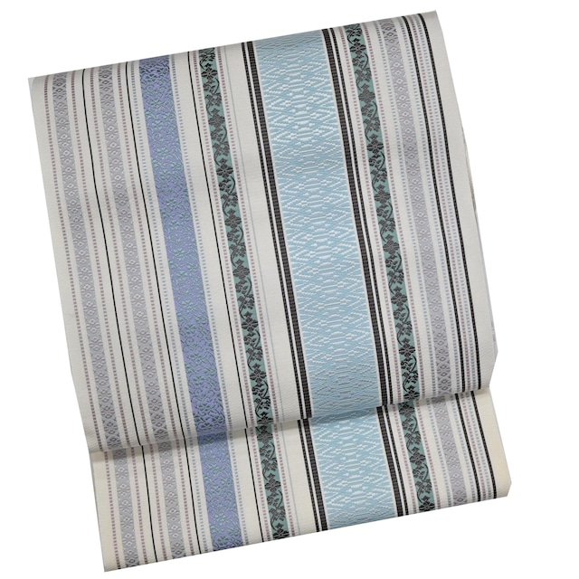 涼やかなミントブルーと、上品なラベンダーパープルのコントラストが美しい一本。 伝統的な博多の技法を用いながらも、配色は極めて現代的でスタイリッシュです。 清潔感のあるオフホワイトを基調に、優しげなストライプ柄。 合わせる着物を選ばず、普段使いからちょっとしたお出かけまで幅広く活躍します。 ぜひ、あなたの着物ライフの定番としてお迎えください。 井上絹織(株)謹製 素材 正絹100%