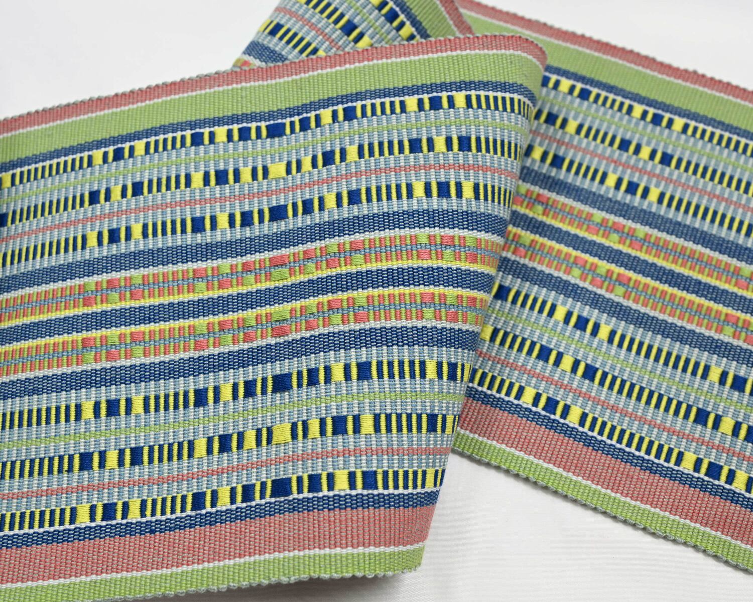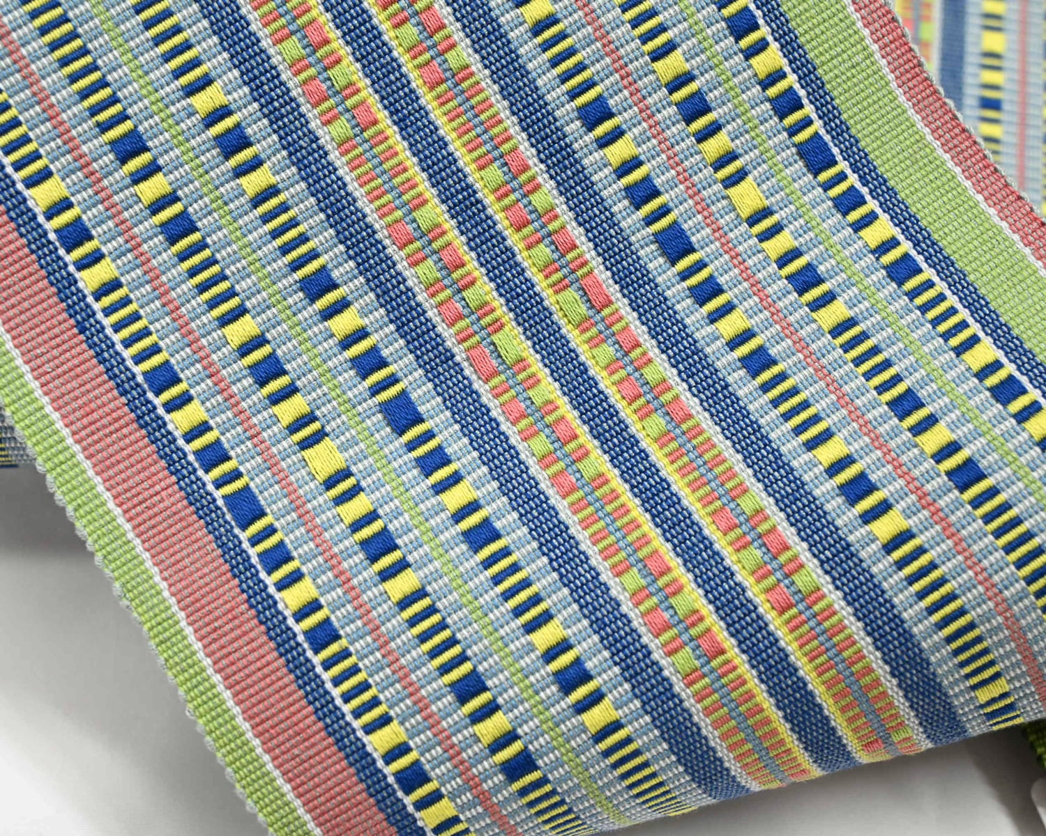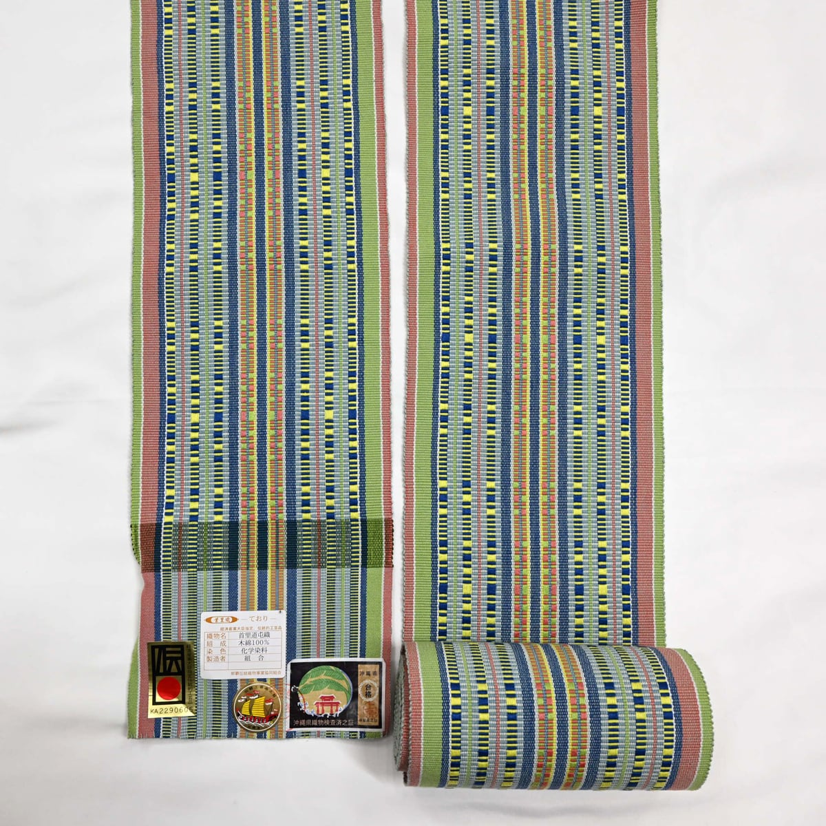 「今日の帯、どれにしよう?」と迷ったとき、思わず手が伸びる一本です。 グリーン、ブルー、イエロー、そしてアクセントのピンク。多彩な色糸をリズミカルに織り込んだこの首里ロートン織は、どんな色の着物や浴衣とも喧嘩せず、不思議と馴染んでしまう「万能選手」。