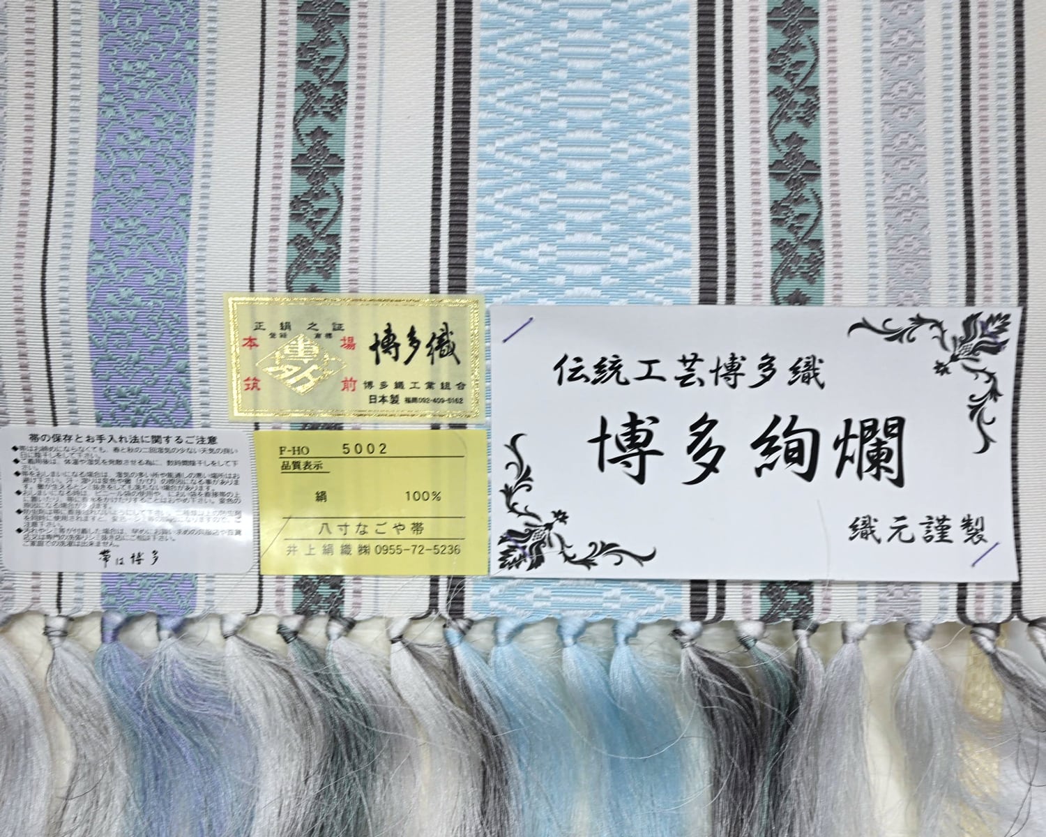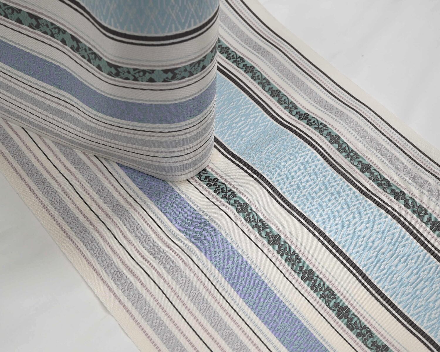 涼やかなミントブルーと、上品なラベンダーパープルのコントラストが美しい一本。 伝統的な博多の技法を用いながらも、配色は極めて現代的でスタイリッシュです。