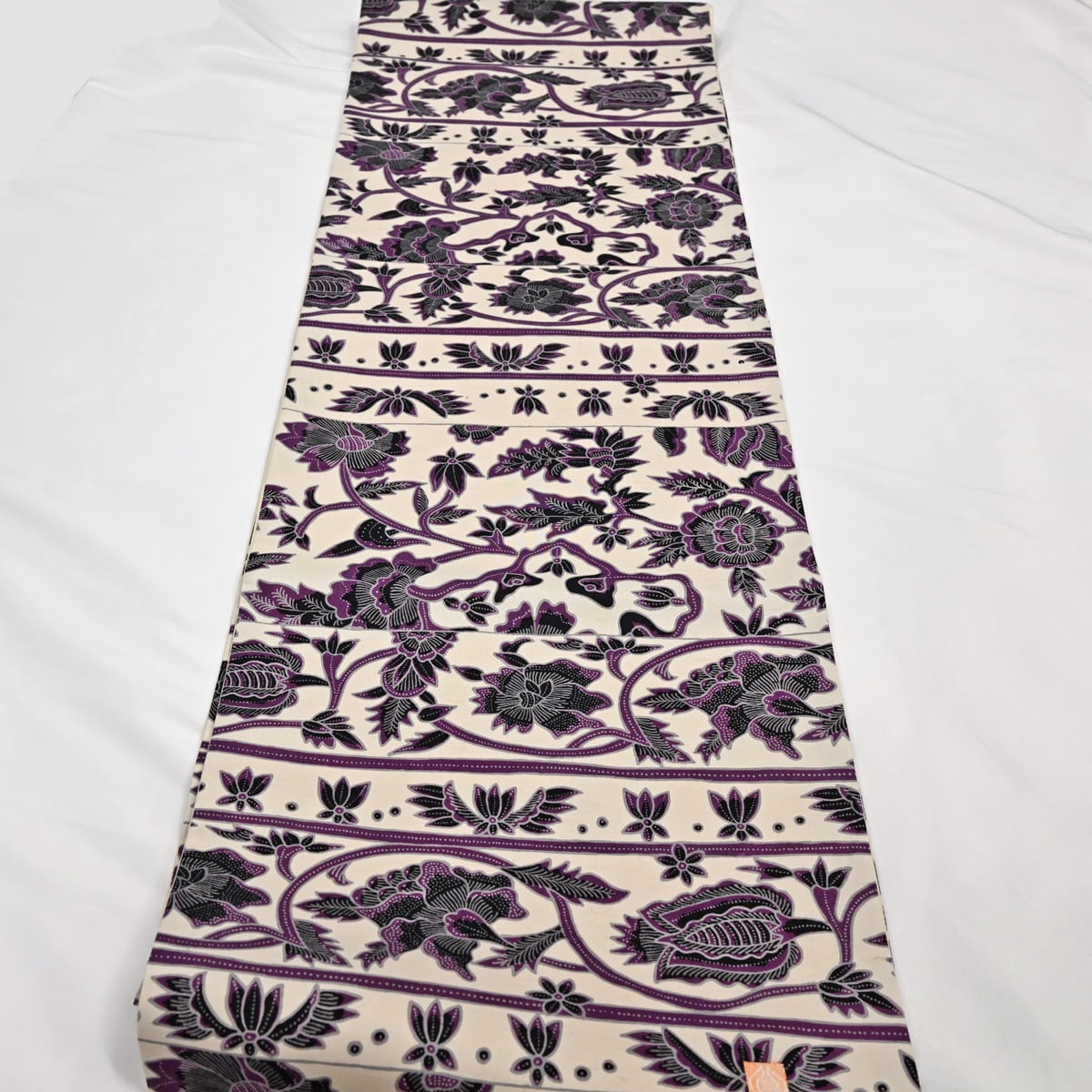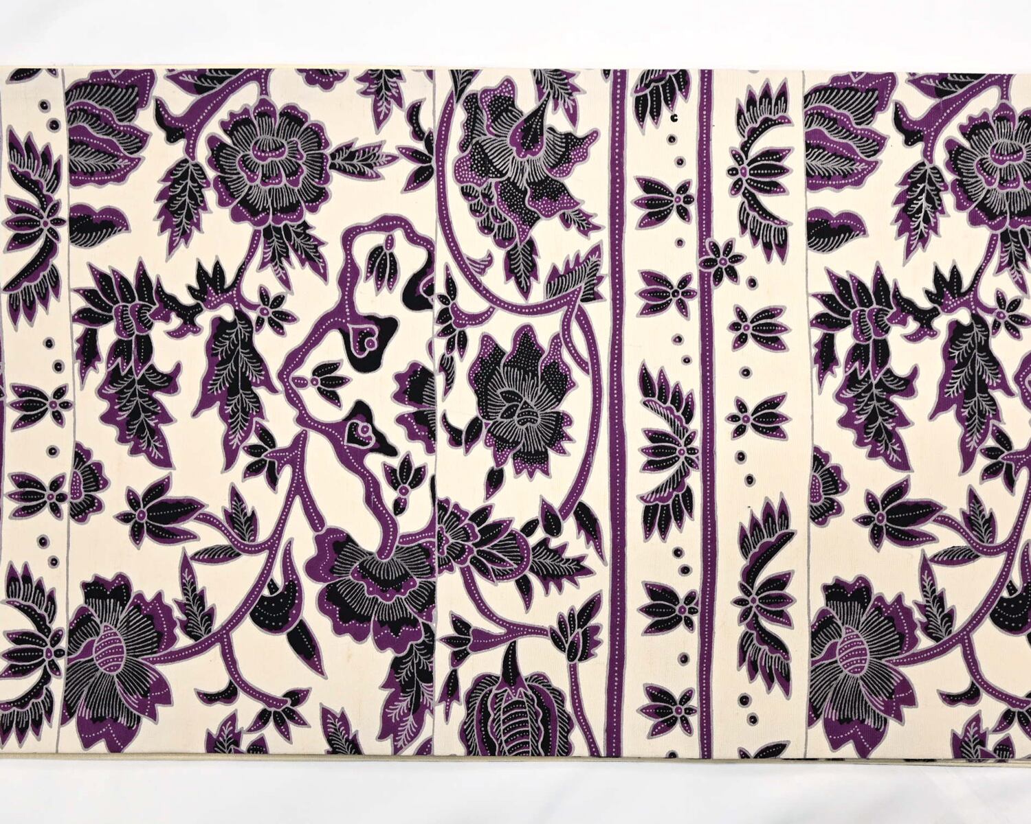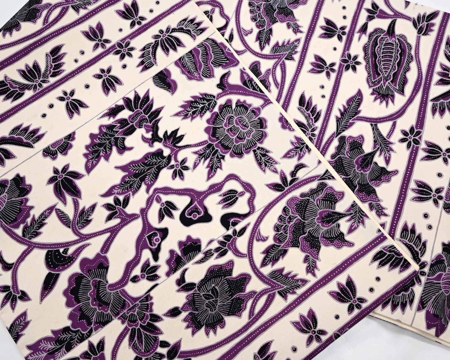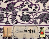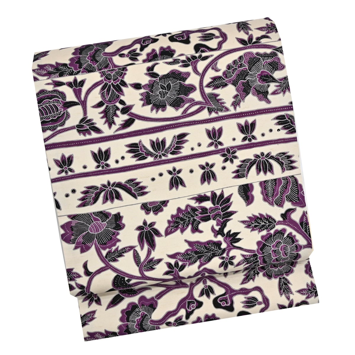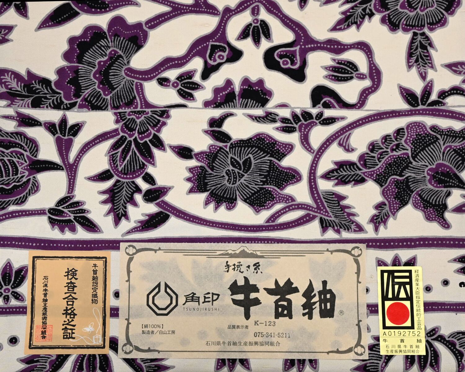 生成り色の地に、エキゾチックな更紗(花唐草)模様を染め上げました。 紫と墨黒の深い色合いが、牛首紬特有の優しく上品な光沢を際立たせています。