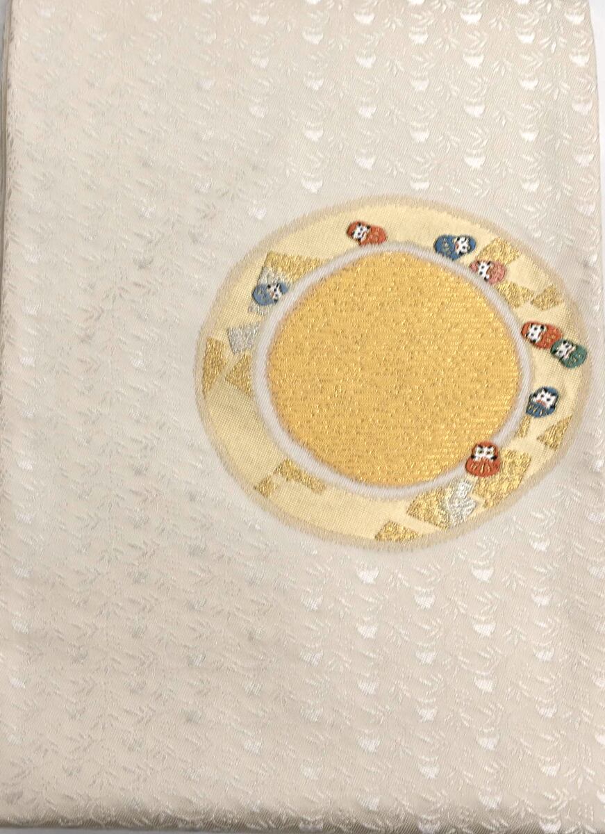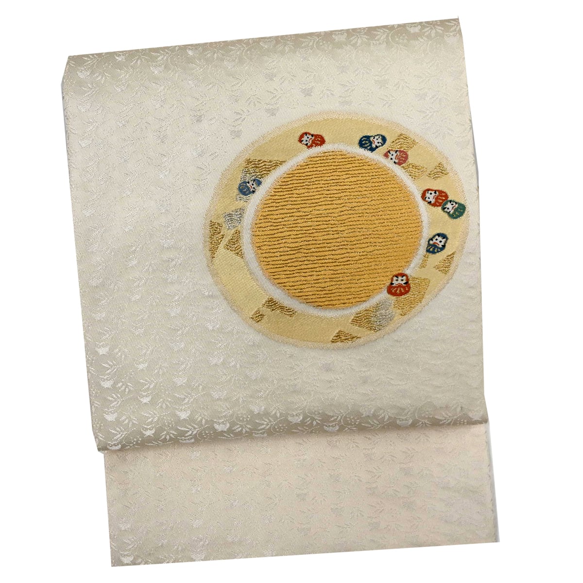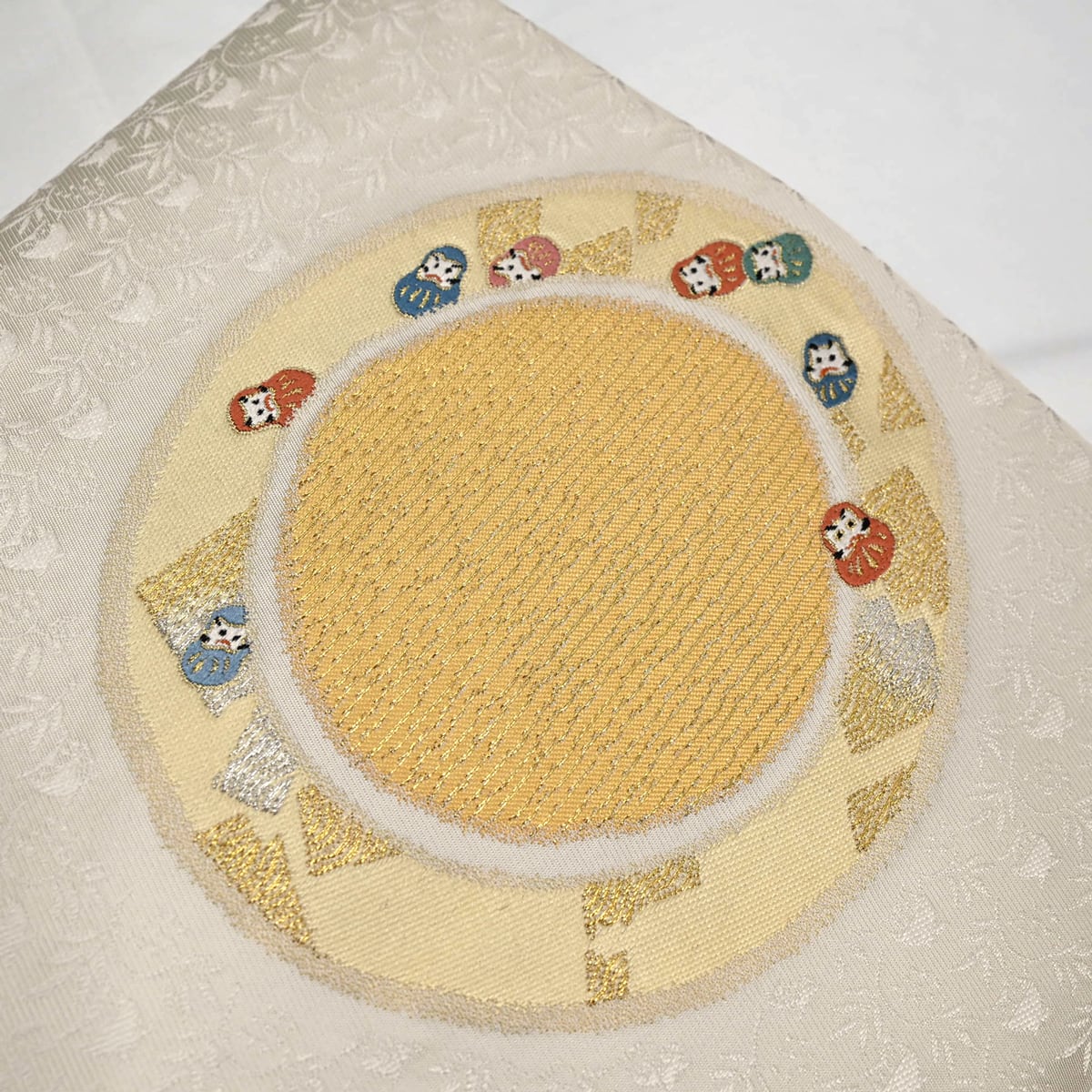 織り出された淡いアイボリーの地紋に、金糸やカラフルな刺繍が映える意匠。お太鼓を飾るだるまさんは、見ているだけで心が和むモチーフです。