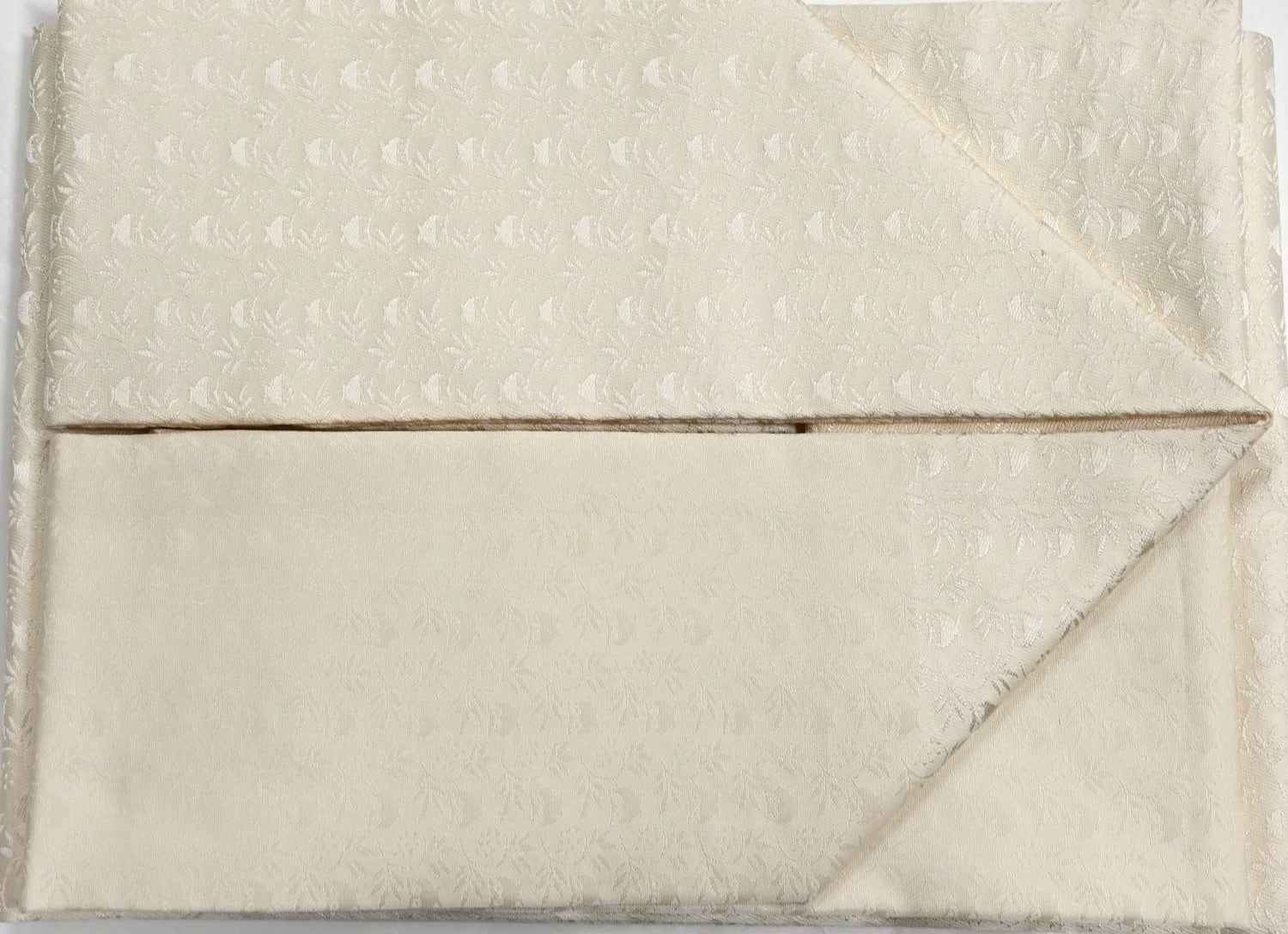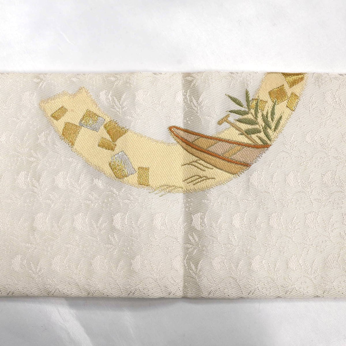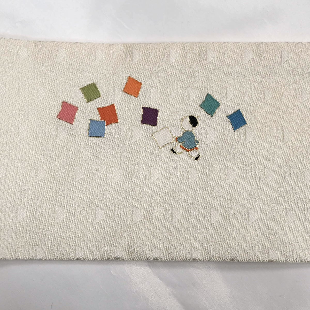 織り出された淡いアイボリーの地紋に、金糸やカラフルな刺繍が映える意匠。お太鼓を飾るだるまさんは、見ているだけで心が和むモチーフです。